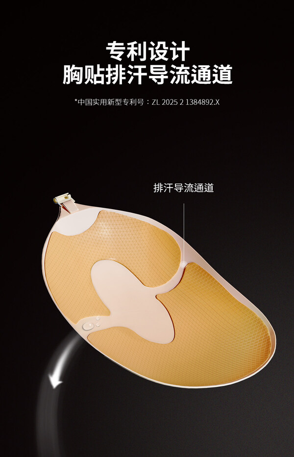 更重要的是,该结构与中心无胶区共同构成了高效的空气循环与排汗导流系统,直指夏季及运动场景下的核心难题 —— 汗液积聚。该设计巧妙利用了双U分段结构,隔断处与中心无胶区形成一条导流通道,不仅能让汗液迅速排出,还能达到通风透气、快速散热的效果。经权威检测,中心无胶区透气率高达140mm/s,这一数据近乎是运动内衣透气标准(≥75mm/s)的两倍,从根本上改善了长时间佩戴的闷热难题,是胸贴产品的一项重要突破。