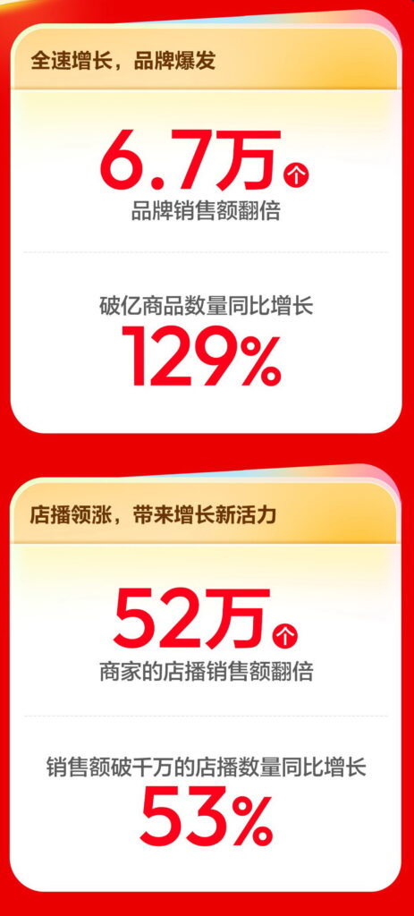 本次大促中,商家销售额持续攀升。今年双11 ,店播成为商家生意贡献主力。商家店播对生意的贡献率进一步提升。更多品牌以自播矩阵,强化品牌形象,沉淀人群资产,收获生意新增长。双11期间,52万个商家的店播销售额翻倍,销售额破千万的店播数量同比增长53%。