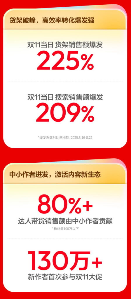 今年以来,抖音电商持续通过明确内容标准和丰富流量激励,优化内容生态。新作者与中小作者快速成长,成为本次双11推动销售额稳健增长的重要力量。众多品牌在双11期间建设自己的达人矩阵,采用 “中小作者 + 短视频种草” 模式,实现了人群破圈和更稳健的生意增长。本次双11,超80%达人带货销售额由粉丝量100万以下的中小作者贡献,超130万个新作者首次参与双11大促。