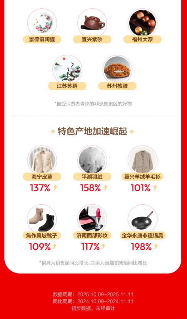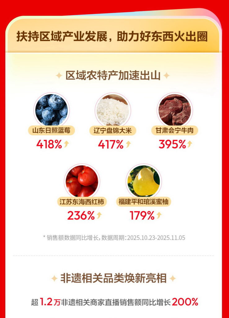 今年双11,抖音电商在带动商家生意增长的同时,以多种方式,助力农业、非遗、地方特色产业发展,让生意更有温度。“豆腐西施”李福贵开启电商首秀,在首场助农直播中,3.4万件太行山小米上架即售罄,带动特色食品、服饰、个护家清等多类目好物热销;借助“开吃节”等专项活动,平台通过短视频、直播等形式将源头农特产推向全国,带动多地特色农产品迎来销售爆发。10月23日至11月5日,山东日照蓝莓销售额同比增长418%,辽宁盘锦大米销售额同比增长417%,甘肃会宁牛肉销售额同比增长395%。