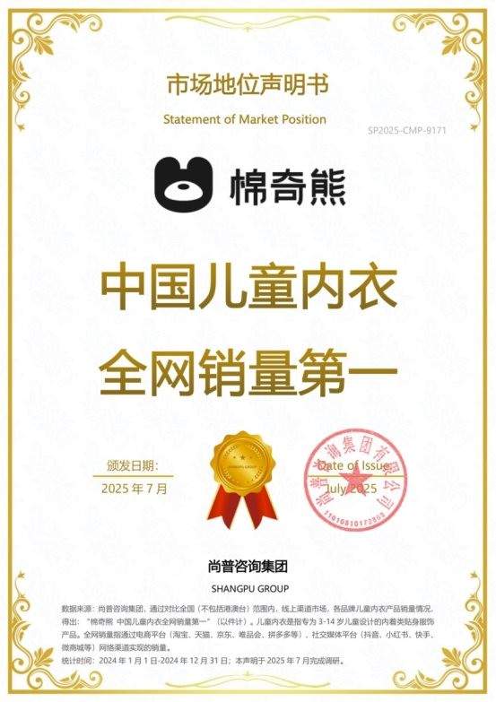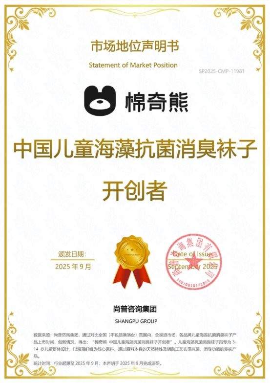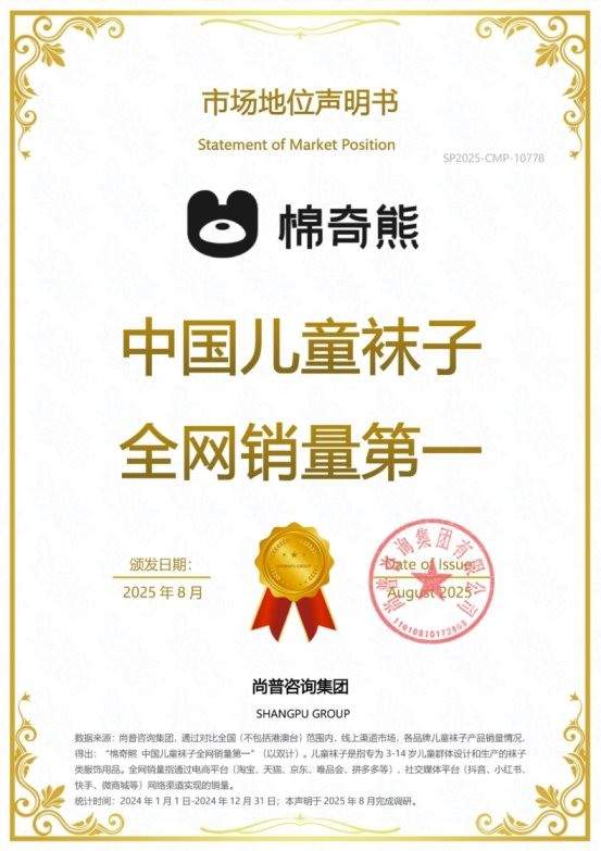 2025年,尚普咨询集团向棉奇熊颁发市场地位声明书。此次棉奇熊荣获尚普咨询【棉奇熊 中国儿童内衣全网销量第一】、【棉奇熊 中国儿童袜子全网销量第一】、【棉奇熊 中国儿童海藻抗菌消臭袜子开创者】市场地位声明,这一成绩不仅彰显了棉奇熊在行业内的卓越地位,也为中国儿童内衣袜市场的发展注入了强大动力。
