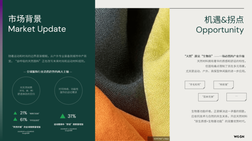 但天然材料固有痛点限制了其在多元场景,尤其是运动、户外、高保型休闲装等领域的进一步应用。能够赋予天然材料更强性能的生物基功能纤维,成为开启天然材料“原生质感+生物基功能”双重优势时代的关键钥匙。白皮书中援引数据指出,2029年,全球生物基材料市场规模将达到2,853亿美元;而2026-2028年间,生物基材料在运动、户外、时尚、家居等领域渗透率将持续提升,成为高增长赛道。
