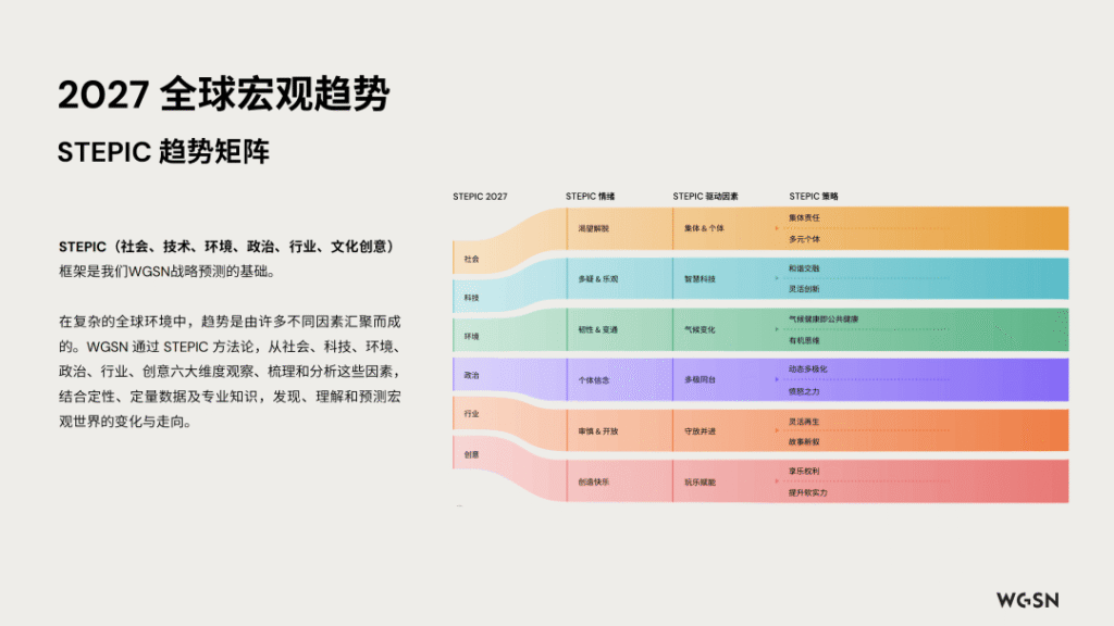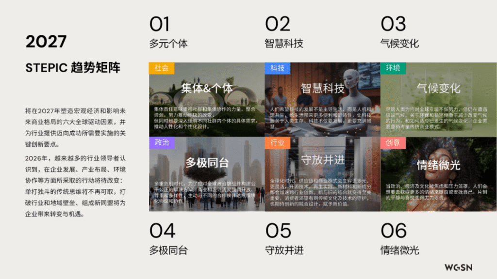 WGSN是全球领先的消费者洞察与流行趋势预测机构。凭借28年的专业趋势预测经验,已构建起覆盖全球的专业研究网络。WGSN 持续追踪全球数以万计的品牌与核心零售商的商业动态。通过独家的 STEPIC 方法论(社会、科技、环境、政治、行业、创意六大维度),深度洞察与解析全球消费者行为与市场的趋势演变规律。